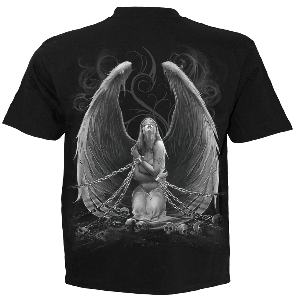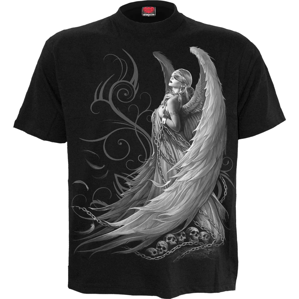 Bound to this mortal coil by the chains of eternity, a blindfolded angel struggles to free herself in the hopes of ascending back to the Heavens that had previously cast her asunder. Held captive, her spirit will not rest.