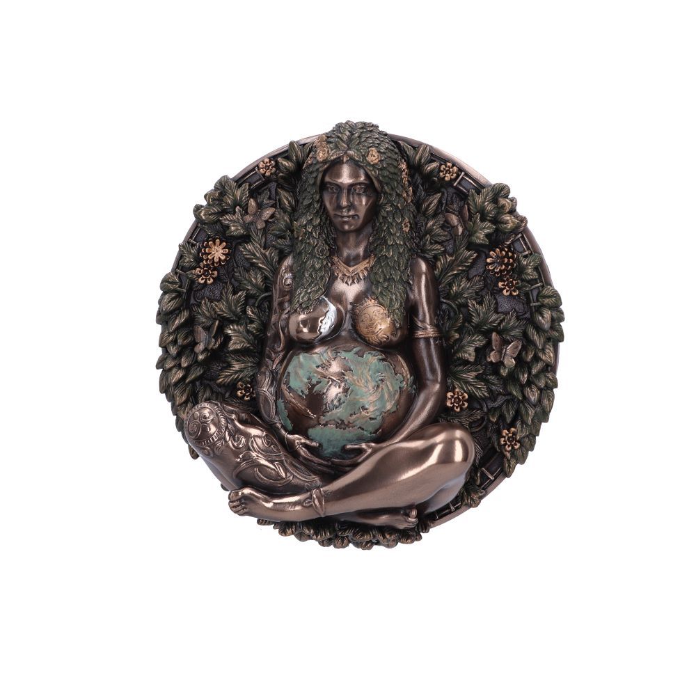 Transcending all in existence, Mother Earth rests, supporting the world as a pregnant belly between her decorated arms. Cascading over her shoulders and down her back, her hair is comprised of green foliage, adorned with intricate golden embellishments. Covering her modesty, the greenery shrouds her breasts which form the celestial Moon and Sun. Surrounded by nature, this Mother Earth plaque is cast in the finest resin before being expertly finished in bronze.
